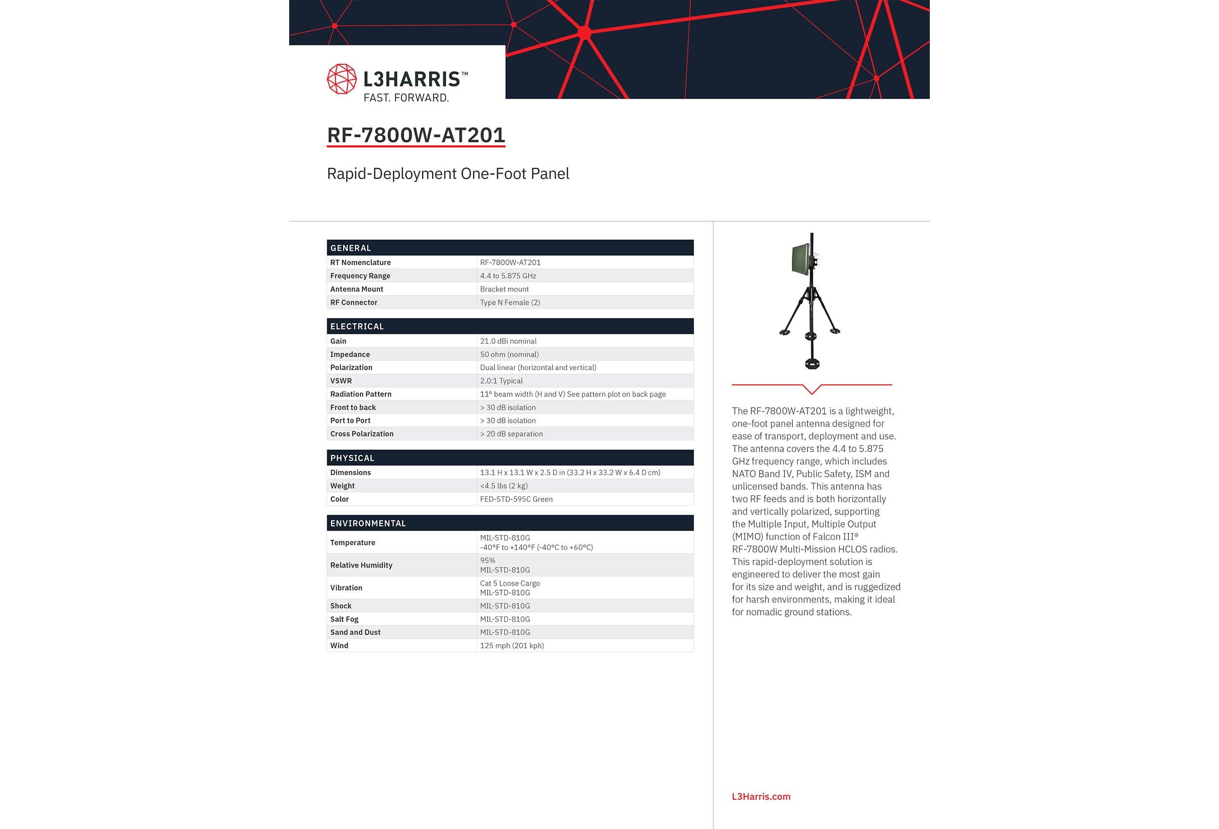RF-7800W-AT201 Rapidly Deployable One-Foot Panel Antenna Spec Sheet